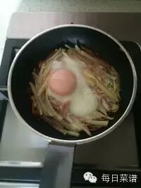 3.炒香变软后,打入鸡蛋,小火煎4-5分钟。