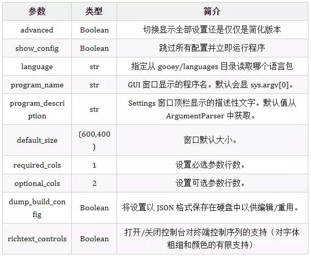 和program_name参数配置一样,Gooey 还支持很多其它配置,下面是它支持的参数列表: