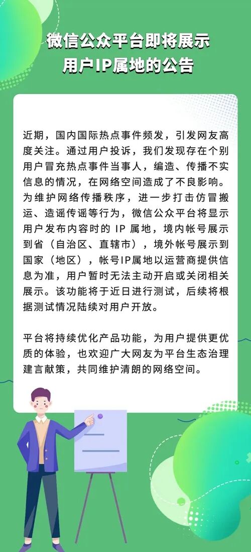 微信表示,为了进一步打击仿冒搬运、造谣传谣等行为。今日头条称,为维护真实有序的讨论氛围,减少冒充热点事件当事人、恶意造谣、蹭流量等不良行为。小红书表示,为维护真实互动的社区氛围,防治冒充热点事件当地网友造谣传谣的行为。![微信将测试IP属地功能。图片来源:“微信珊瑚安全”公众号。]()