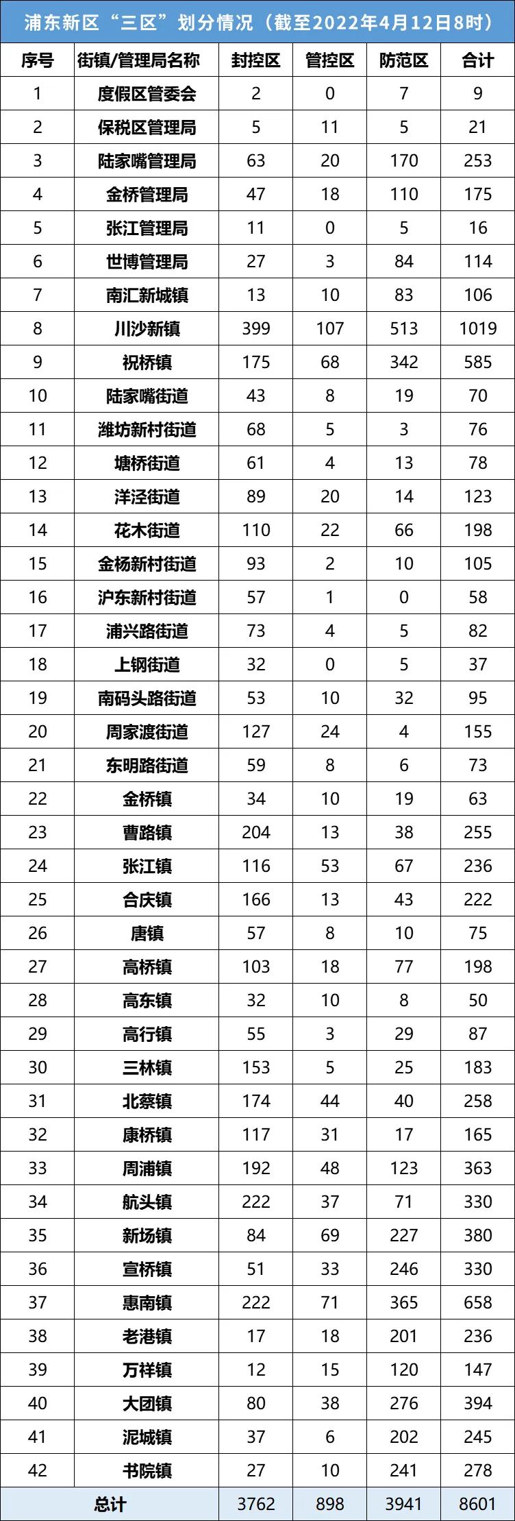 截至2022年4月12日8时,根据筛查结果和风险研判,浦东新区划定第一批“三区”名单8601个,其中封控区3762个,管控区898个,防范区3941个。