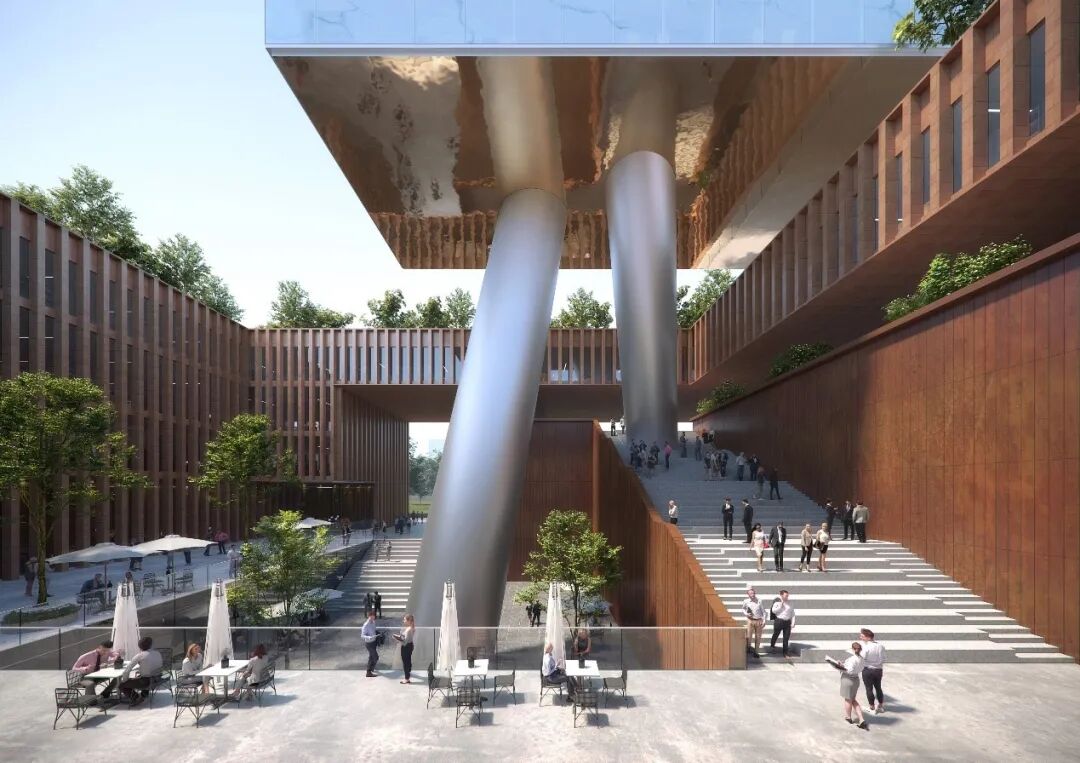 设计通过围合型的建筑形式,将外部混杂的空间与内部灵动的中庭空间隔绝开,为使用者提供安静惬意的生产研发空间。建筑顶部的玻璃展示部分,保证建筑通透性的同时,提供了优越的视野景观。