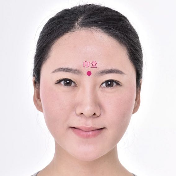 瞳孔直上方,眉毛上1指。