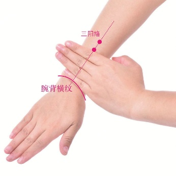 先在腕背横纹上4横指,再直上1指的位置,在两骨头之间的凹陷处。