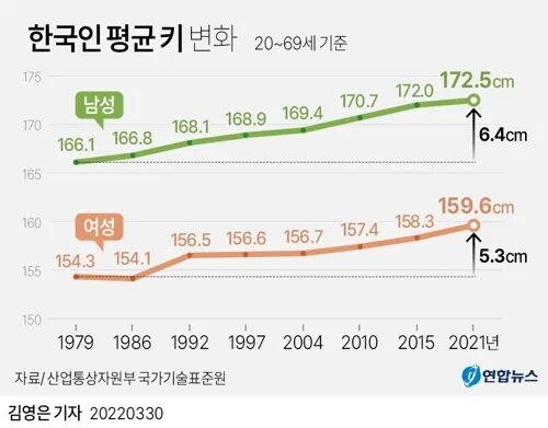邻国韩国今年4月份发布了《第8次韩国人体指数调查》,根据这项由韩国产业通商资源部下属国家技术标准院经过一年半的数据收集才出炉的调查报告,韩国20岁到69岁的国民中,男性平均身高为172.5厘米,女性为159.6厘米。