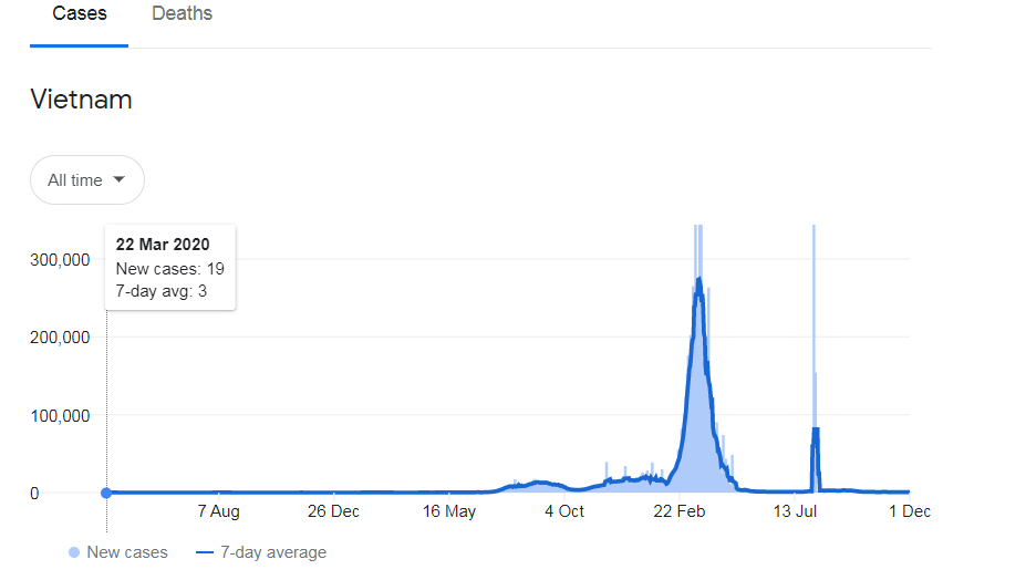 在第一波疫情海啸时,越南曾经连续99天没有本土感染病例,直到2021年3月,累计确诊病例还不到2500例。