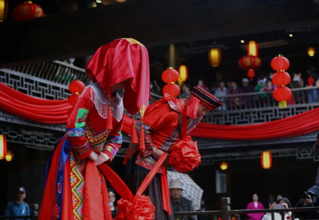 拜堂、抛绣球、长龙宴、歌舞表演……再现了土家族完整的婚礼民俗,引来八方游客驻足观看。