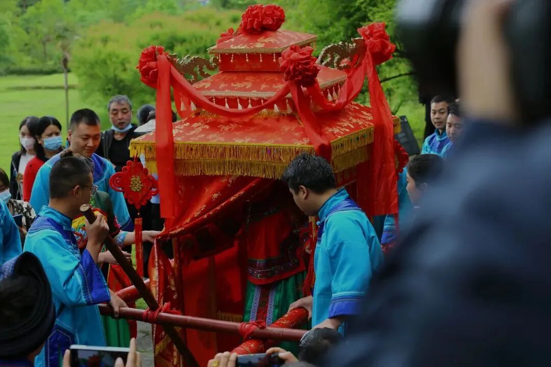 在姊妹的陪伴下,新娘来到“荆南雄镇”石牌坊前,向土司祖先和父母鞠躬辞别,由哥哥背上花轿。