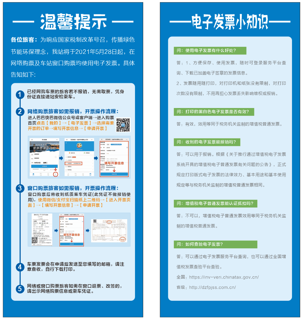 此外,不管是线上还是线下,旅客购票后,车站均不再打印纸质汽车票。“旅客可在乘车后次日起30天内,关注‘巴巴快巴’微信公众号或下载‘巴巴快巴’客户端,点击‘我的’,再选择‘电子发票’,凭有效购票信息开具电子发票。”该负责人表示,电子发票会根据申请,发送到购票人邮箱内,下载打印即可用于报销。