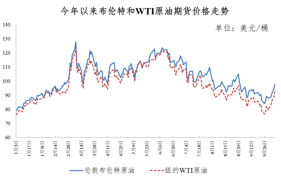调价周期内国际油价先降后升,美联储如期加息75个基点,美元指数再创20年新高,油价一度跌至今年1月中旬以来低点,但“欧佩克+”减产决议刺激油价大幅反弹。“欧佩克+”月度会议决定11月、12月缩减原油产量200万桶/日,为近两年最大力度减产,超出市场预期。此外,美国原油库存下降、墨西哥湾飓风灾害,多重因素影响下国际油价连续5个交易日上升,伦敦布伦特、纽约WTI原油期货价格累计分别上涨13.15美元、9.96美元,涨幅分别为16.54%、11.32%,创今年3月以来最大单周涨幅。平均来看,本轮调价周期伦敦布伦特、纽约WTI油价分别比上个调价周期略有下降,叠加人民币汇率变动因素,调价金额每吨不足50元。