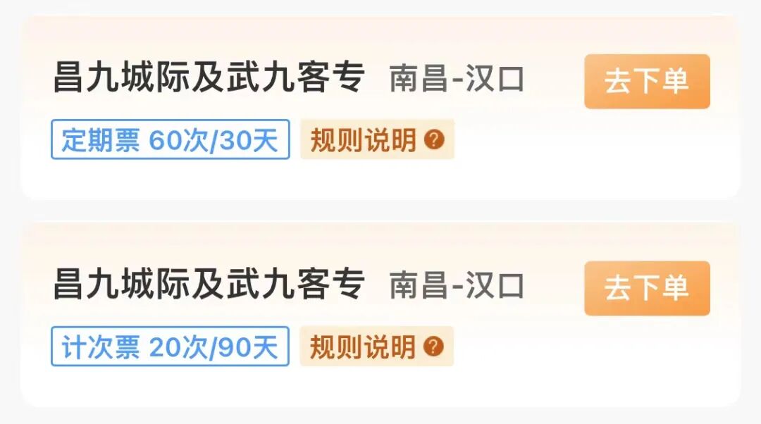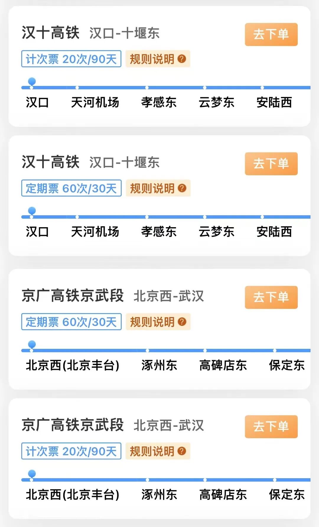 目前,汉口至十堰东、北京西至武汉区间均开通了定期票、计次票。