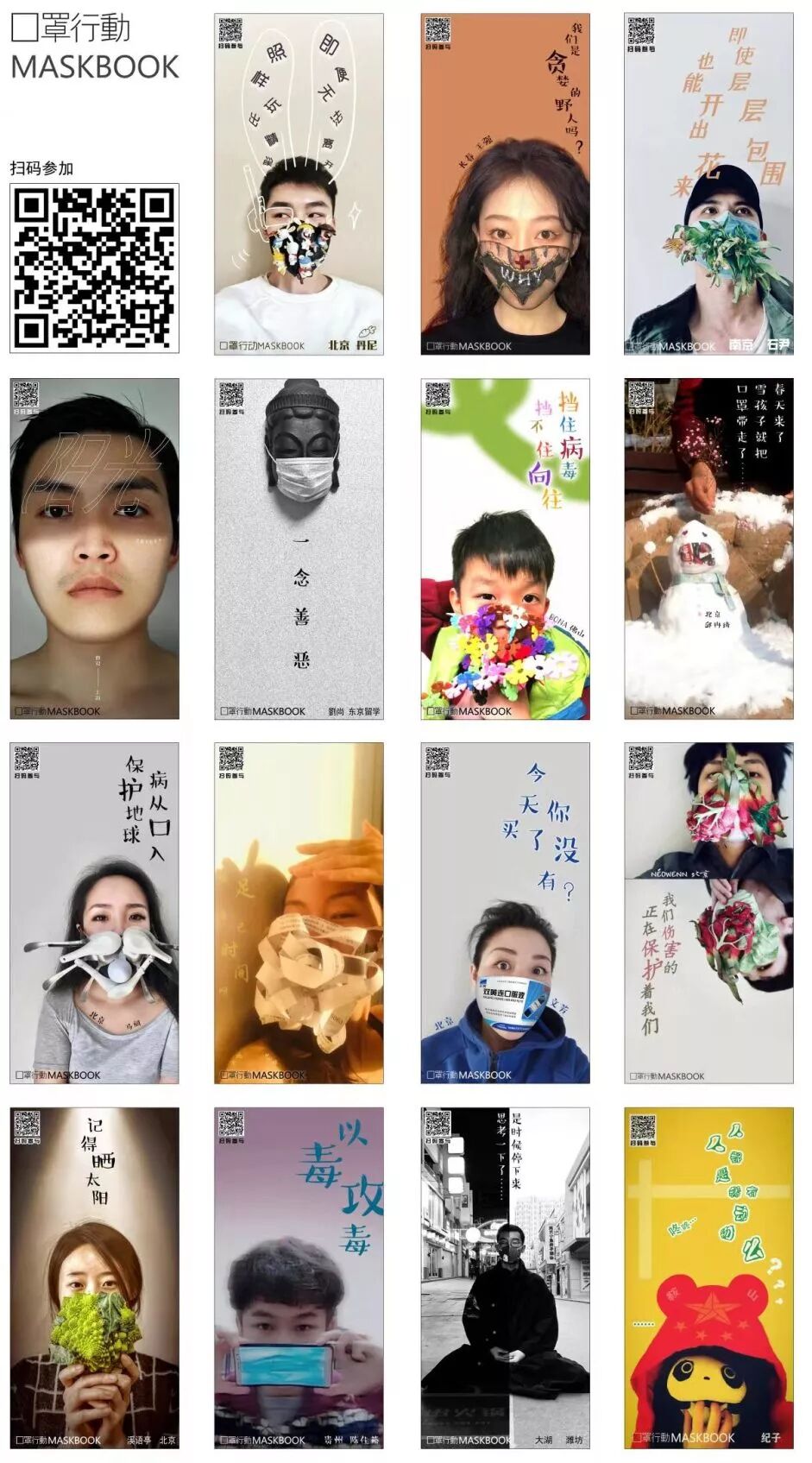▲ “口罩行动MASKBOOK”自2020年1月底针对新型冠状病毒感染的肺炎疫情(2019-nCoV)重启以来,参与者创作的第一批艺术口罩。