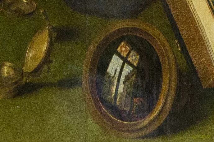 特别需要注意的是桌上的一面凸镜,透过这面凸镜我们可以看到长方形的窗和画家本人的形象,还能看到街上的房子和树林,表现出极为精湛的观察和表现力,这样的处理显然是受到杨·凡·艾克的影响和启发。
