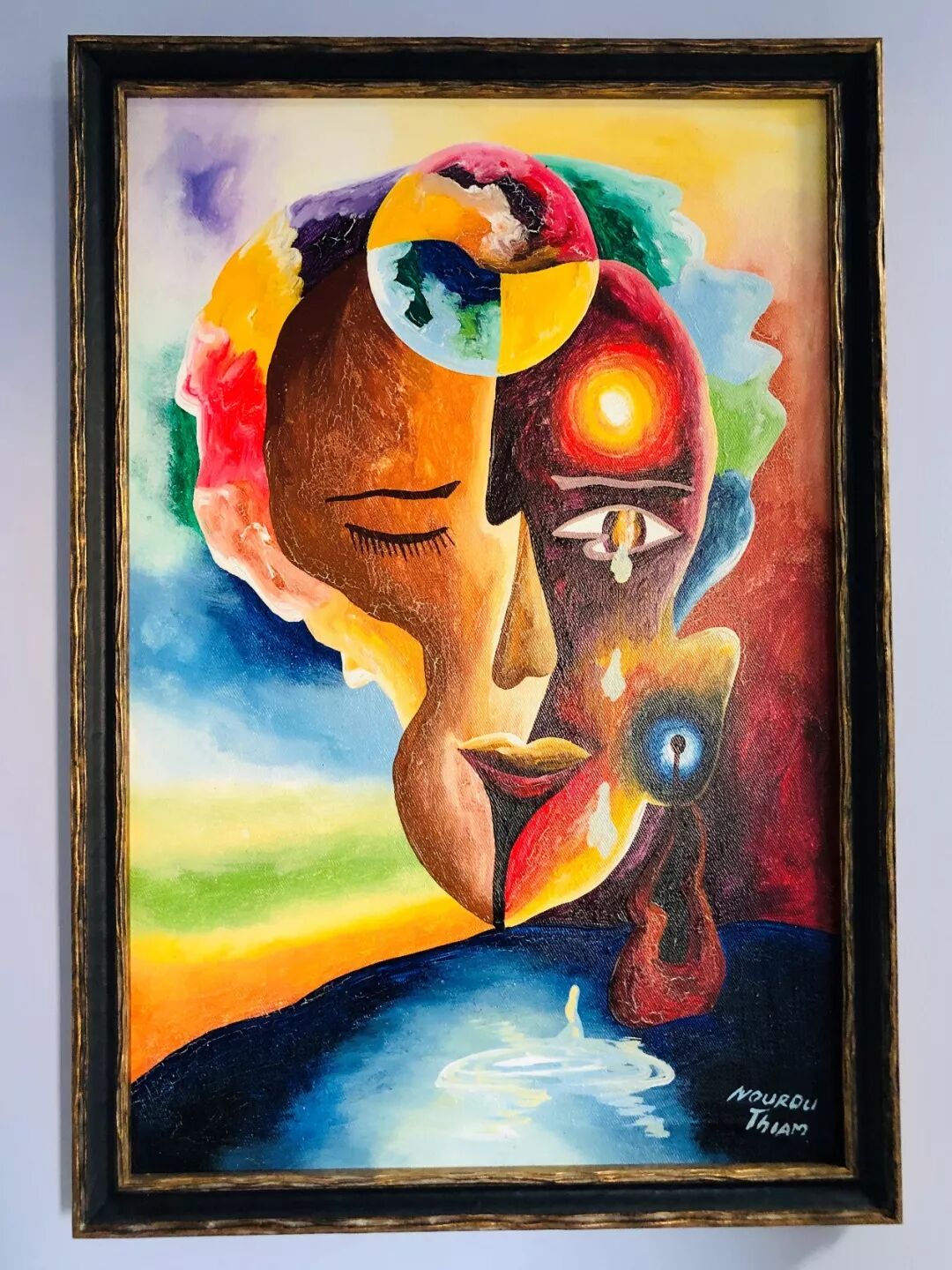 A:这幅画我是在巴黎街头开车闲逛时看到的,当时只是被作品的一滴泪目和缤纷色彩吸引,临时下车买的,问了下店家老板,说这是他的一个黑人艺术家NOUROU THIAM朋友的作品,很独特,因为语言不通,我并没有了解太多这幅作品的背景,但是不影响它对我的吸引。