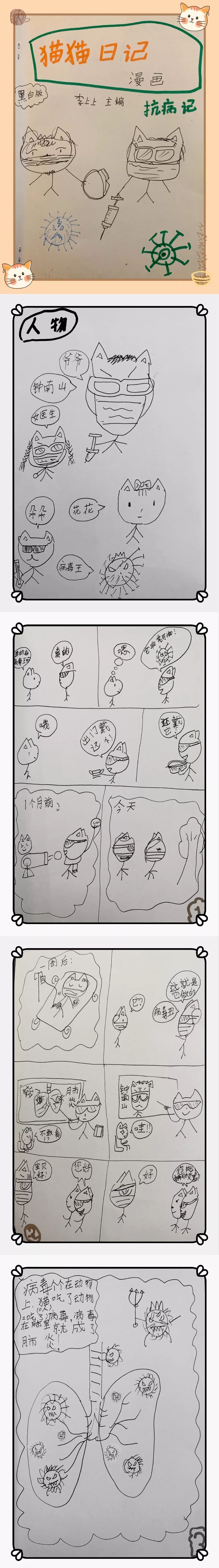A:疫情让每个人的心情像过山车一样起起落落,所以看作品的情绪难免会夹杂个人色彩,有些暗淡。所以我推荐了孩子的两件作品:一件是漫画《猫猫日记之抗病记》,表达了孩子对病毒影响的切身感受和对医疗工作者的敬佩;另一件作品是画了她眼中的钟南山爷爷,做成护身符,和援助物资一起寄给武汉的朋友们。