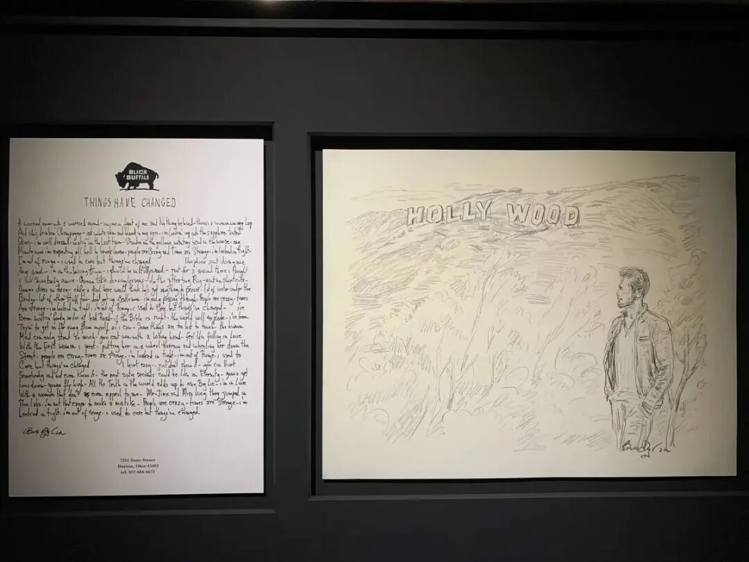 二十世纪六十年代,后现代主义艺术兴起,迪伦的绘画受时代影响较大,但他也喜欢像丢勒、伦勃朗、鲁本斯、勒布伦等艺术大师的作品。此次展览中的“写写画画”系列是他为歌词手稿所绘制的素描作品,这批素描画是迪伦对自己的音乐创作,尤其歌词部分的重新注解。
