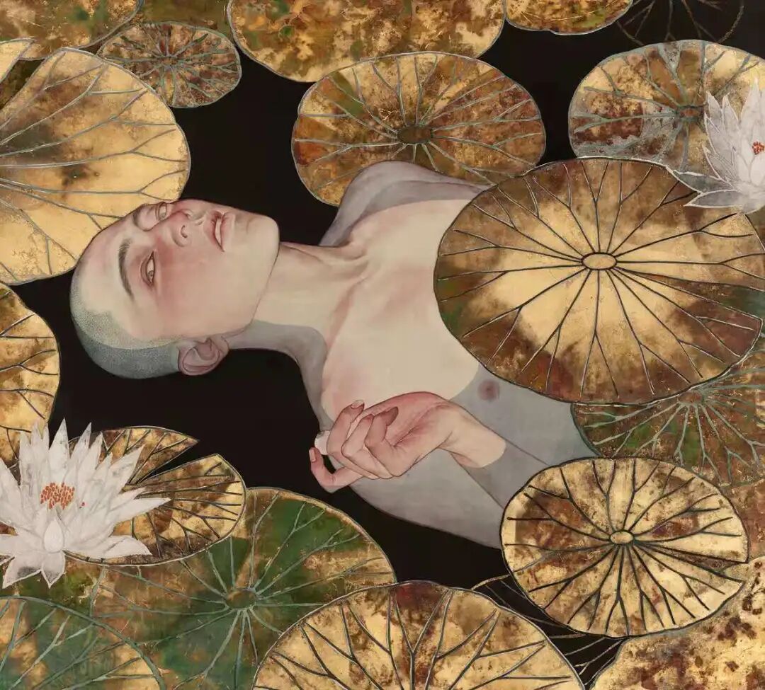 极具识别度的唯美忧郁,詹佶昂的作品像一张张幽深的镜面,用古朴的色彩与金银铜箔映照出复古式的绚烂和现代的孤独感。其中《逐水漂流》灵感来源于《奥菲利亚》,只不过躺在莲花池中的人物用延伸探索观众的目光,似乎想透过生死元素的交错向世界诉说些什么。