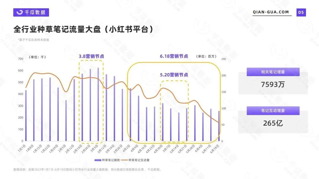 2022上半年,小红书行业流量数据依旧十分亮眼, 各大品牌相互角逐,经历三八妇女节、520、618等各大营销节点,累积种草笔记7593万篇,创造出近265亿互动总量。