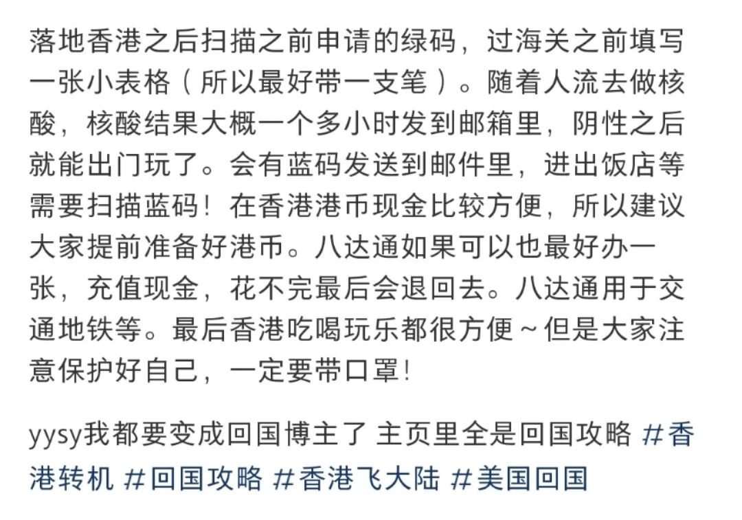 新措施推出后,部分留学生已经开始回来,从同学们的反馈来看,14号开放后,无论是美国回香港转机,还是在港研究生回内地,都很丝滑。