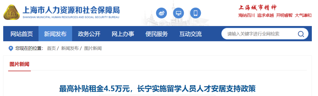 上海 :长宁区留学人员安居补贴每月最高4万、最长12个月,还可申请专属人才公寓 (世界排名前100名或者所学专业世界排名前20)