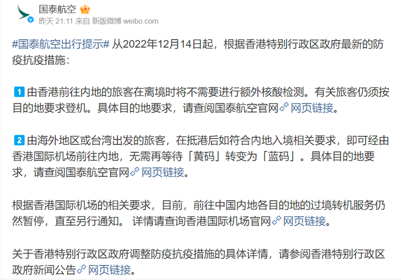 取消入境隔离!取消黄码限制!取消额外核酸检测!换言之,香港正式实行入境免隔离!同学们想从香港转机回内地更加方便了!