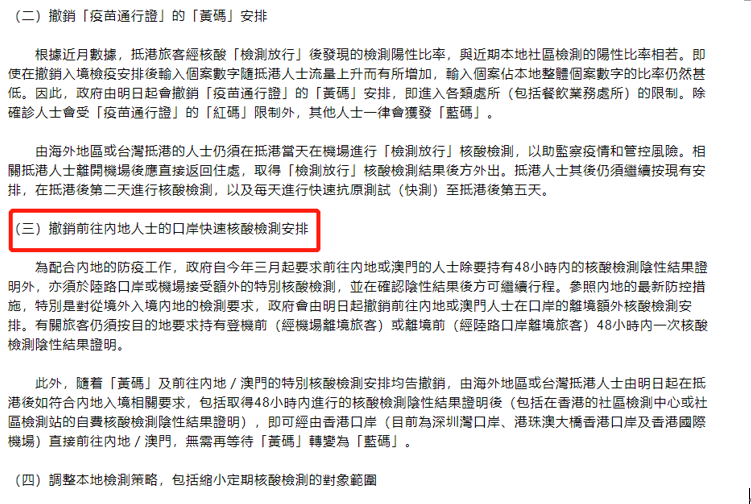 此外,自香港前往内地和澳门,今后也无须在口岸进行核酸检测。
