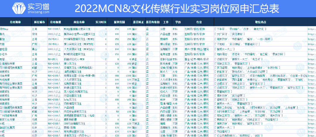 💧2022MCN&文化传媒行业实习岗位网申汇总表