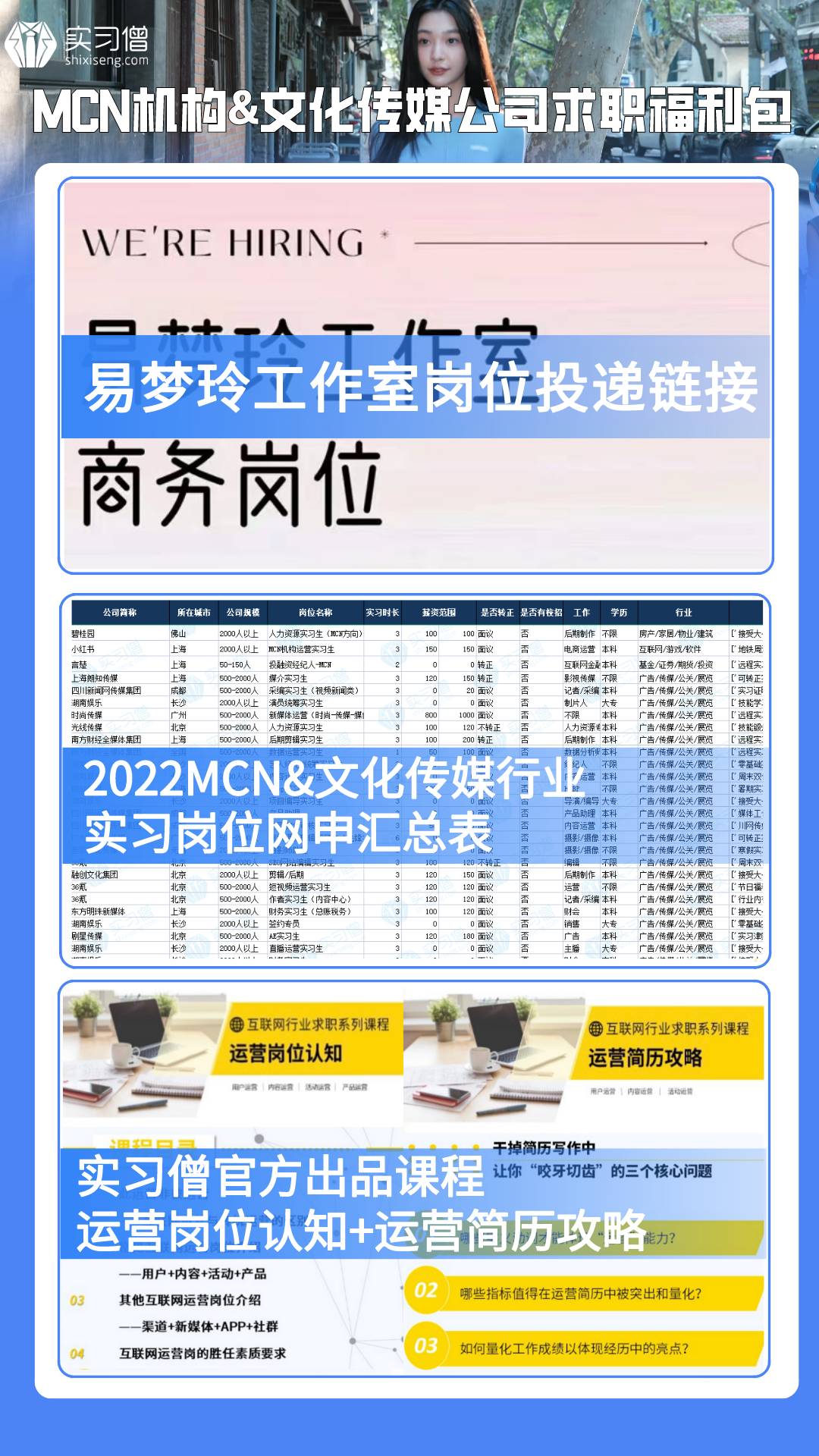 僧妞火速整理了MCN机构&文化传媒公司求职福利包,这个寒假,与其隔着屏幕追星,不如近距离感受他们的力量,与你的爱豆并肩作战,共同成长!