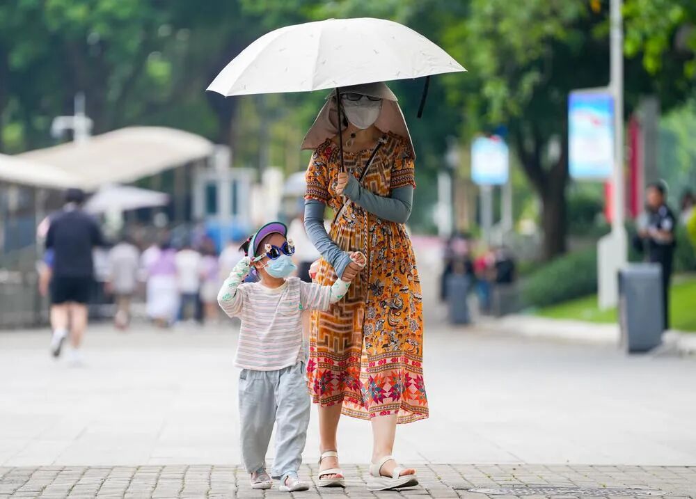 9月16日,广州街头,大人和小孩皆做好严密“防晒”措施 梁怿韬 摄