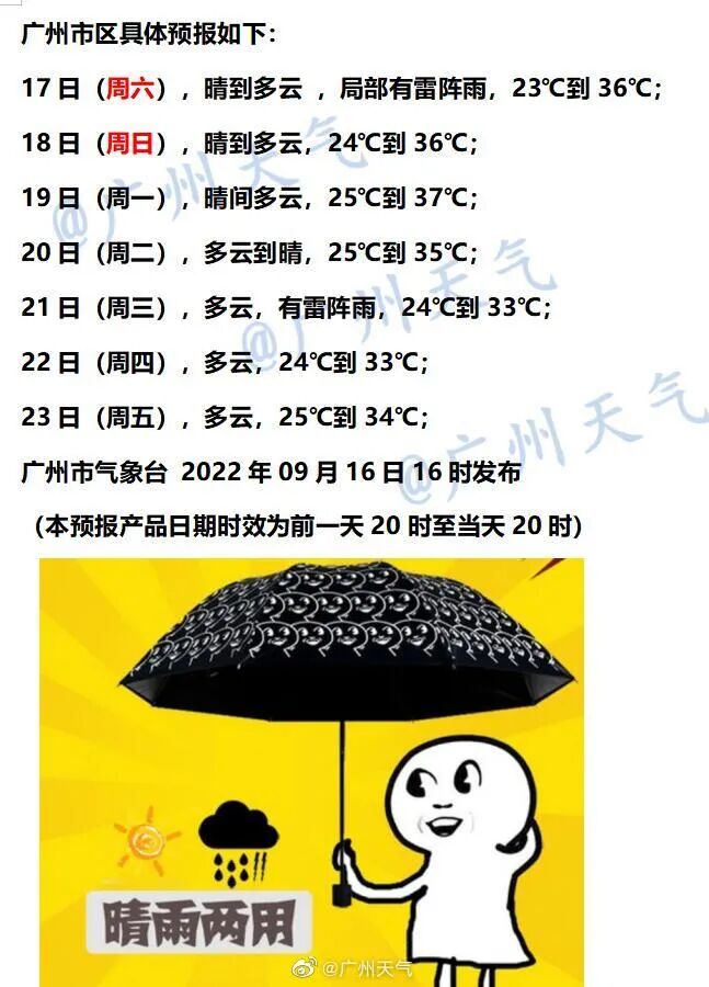 广东省气象部门9月16日预计,9月20日前后有弱冷空气影响广东,预计会为广东带来阵雨和略降温天气。根据广州市气象台9月16日的十天趋势预报,9月20日至21日广州可能受到弱冷空气和边界层气流影响,雷雨趋明显,市区最高气温或从9月19日的37℃,降至9月21日的33℃。