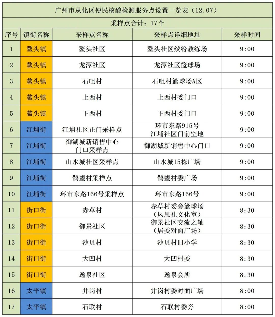 从化区在辖内设置便民绿码、黄码核酸检测采样点,12月7日具体安排如下(如遇天气变化等原因可能会临时取消或调整):
