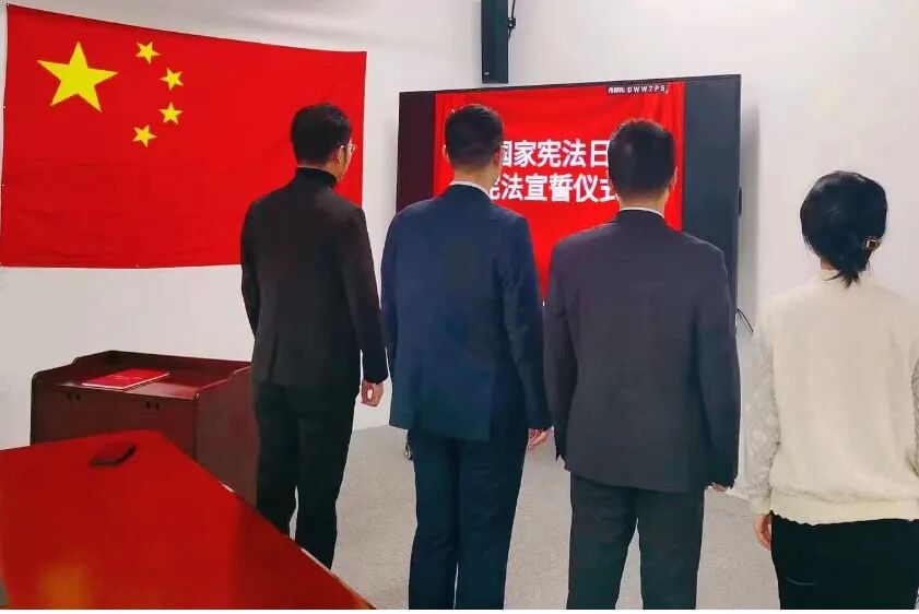 宪法宣誓仪式上,全局新入职的国家机关工作人员面向国旗列队肃立,高举右手,庄严宣誓。