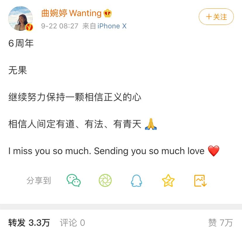 9月22日,曲婉婷微博发文,“6周年无果,继续努力保持一颗相信正义的心”,“相信人间定有道、有法、有青天。”表达对因涉嫌贪污、受贿、滥用职权三项罪名被羁押的母亲张明杰的思念。