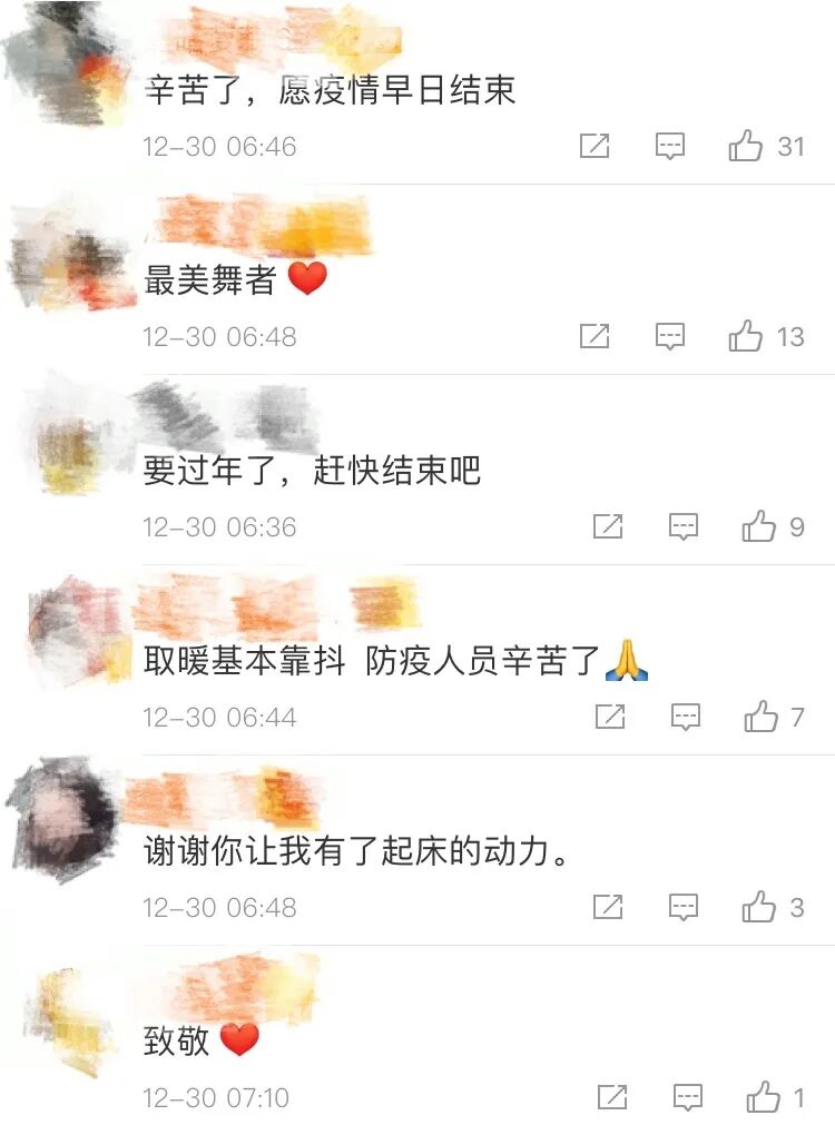 12月29日,辽宁大连。一位网友发布了一条让人既感动又心疼的视频——一位身着白色防护服的防疫工作者在小区楼下的寒风中蹦蹦跳跳,笨拙“起舞”。