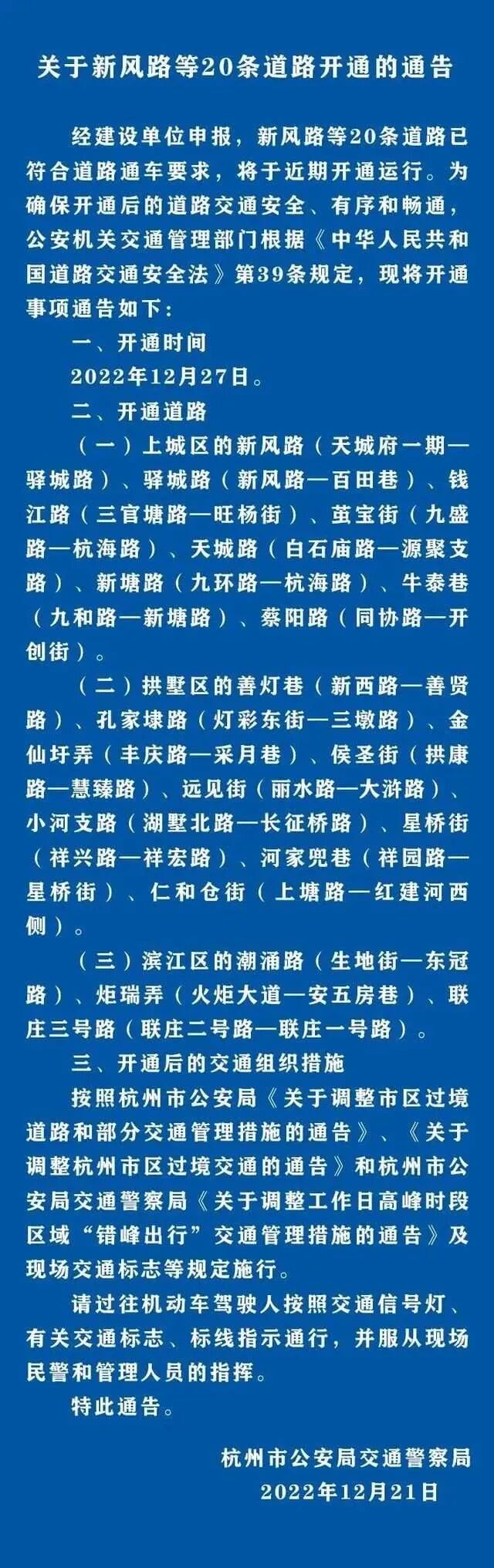 按照杭州市公安局《关于调整市区过境道路和部分交通管理措施的通告》、《关于调整杭州市区过境交通的通告》和杭州市公安局交通警察局《关于调整工作日高峰时段区域“错峰出行”交通管理措施的通告》及现场交通标志等规定施行。