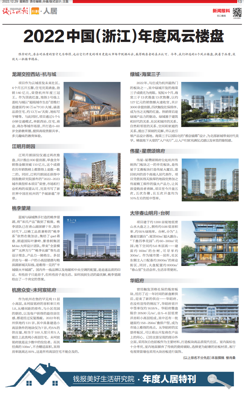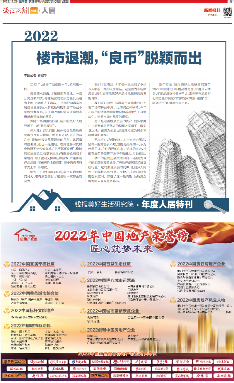 新年将至,钱报美好生活研究院发布2022中国(浙江)年度品牌房企、年度风云楼盘、年度品质交付等榜单,让那些坚守品质初心的房企得到应有的肯定和尊重,重塑“良币驱逐劣币”的健康行业生态。