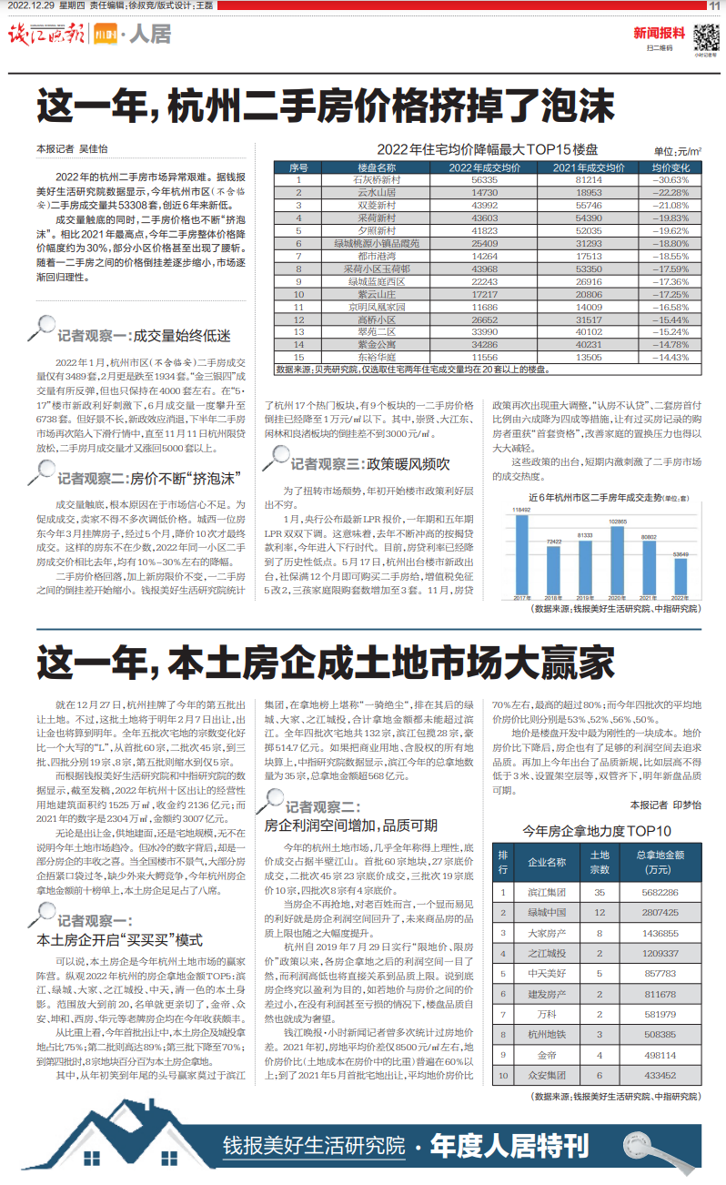 2022年,是楼市退潮的一年,杭州也一样。