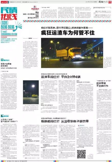 四川日报两名记者深入采访。连续几个晚上,蹲守在不同路口,拍下上百段运渣车闯红灯的视频;驾车跟踪,从一个工地到另一个工地,从一个渣土场到另一个渣土场。过程中,记者被运渣车司机包围、跟踪、驱赶……但没有被吓退。