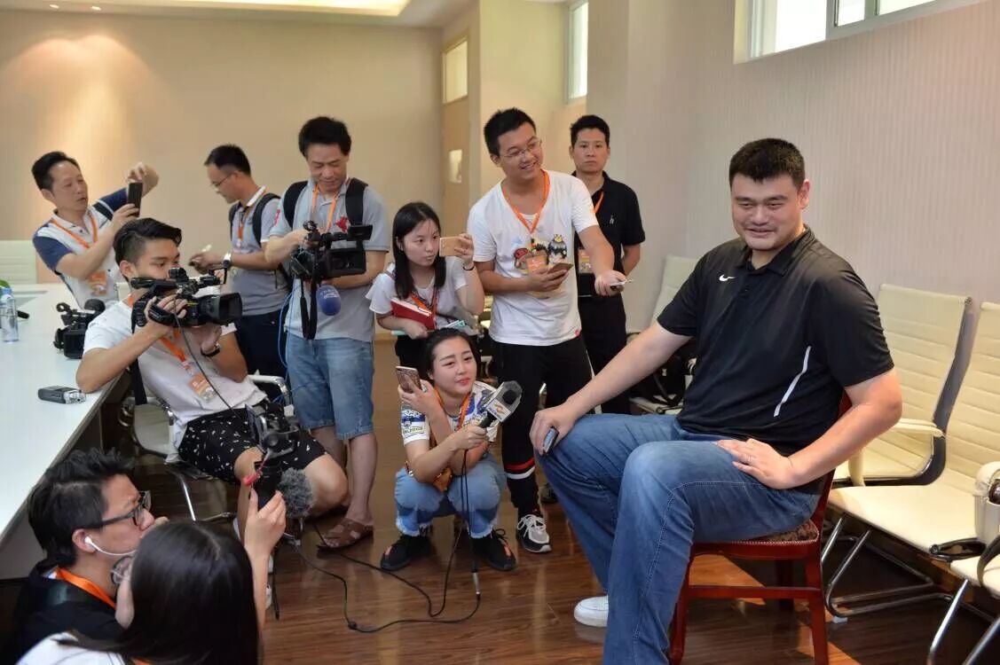 记者邵明亮采访小巨人姚明▼