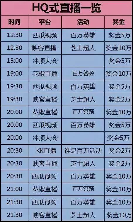 从单场奖金额度来看,各大平台一般设置在5万到20万之间,一天数场。为吸引用户,平台有时也会将金额提升至100万,多数时间在晚上。