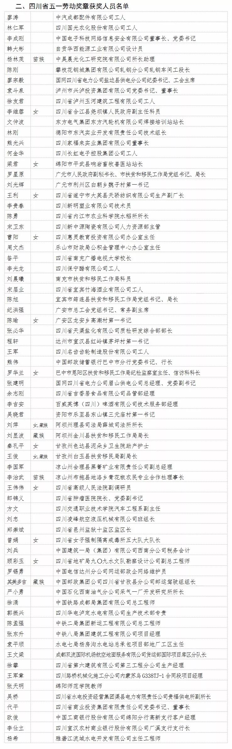 2018年四川省五一劳动奖获奖名单