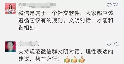 我们支持用户在微信内的合理自由表达,但也提醒并建议大家进行文明对话、理性沟通。微信群建立者、管理者也应当对微信群进行有效管理,我们呼吁并提醒广大用户自觉规范群组使用行为,构建文明有序的网络群体空间。
