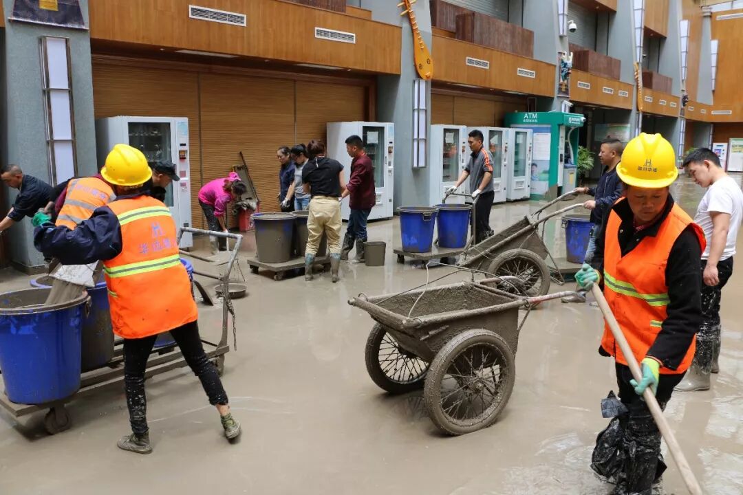 6月26日,乐山境内普降大暴雨,双福镇一中学内洪水倒灌,172名学生正在教室考试,8名老师和职工合力堵住校门,防止洪水再次流入。所幸学生考试未受影响,下午洪水退去,学生们安全回家。
