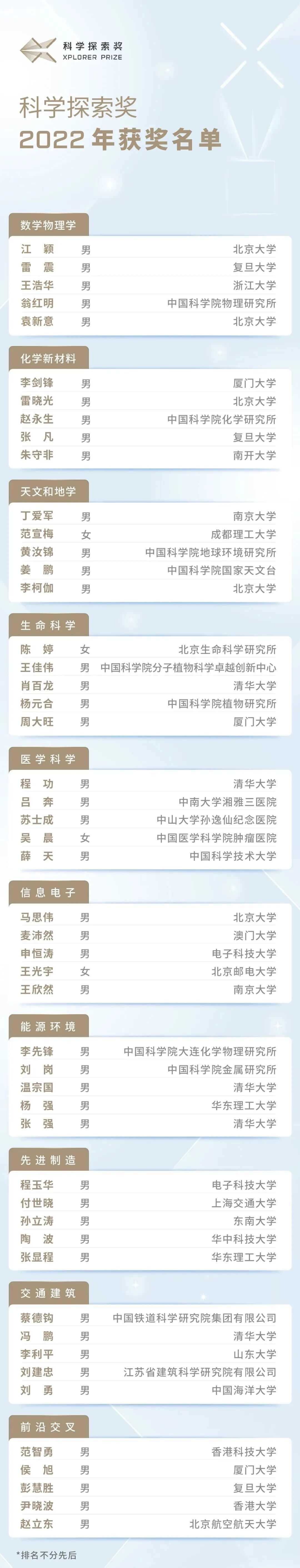 “科学探索奖”2022年获奖名单