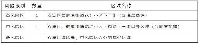 根据当前双流区疫情防控工作需要,按照国务院应对新型冠状病毒肺炎疫情联防联控机制综合组《新型冠状病毒肺炎防控方案(第九版)》的规定和专家综合评估,经成都市双流区新型冠状病毒肺炎疫情防控指挥部研究决定:自2022年11月2日14时起,将成都市双流区西航港街道花红小区下三街(含底层商铺)的风险等级调整为高风险区;西航港街道花红小区下街除下三街以外的区域(含底层商铺)的风险等级调整为中风险区。成都市双流区除高、中风险区以外的其他区域为低风险区,其中西航港街道花红小区中街为临时管控区。
