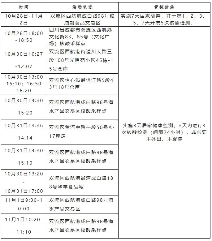 10月30日14:58-15:20,16:28-17:00 11月2日14:11-14:30 | 成都东站出站通道、省外来蓉人员通道、西广场核酸采样点(邛崃山路333号) |