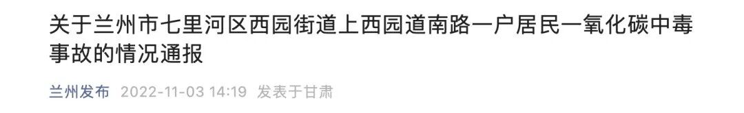 11月3日中午,兰州发布公众号发布《关于兰州市七里河区西园街道上西园道南路一户居民一氧化碳中毒事故的情况通报》,通报具体如下: