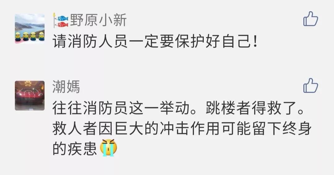 跳楼男子得救了,消防员张昊明却在接住跳楼男子时,双手及大腿由于受到巨大冲击力,均不同程度受了伤,目前正在医院接受治疗,无生命危险。