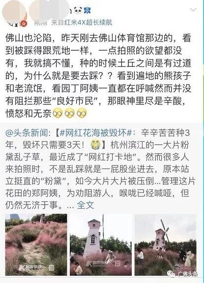 此外,丹灶镇翰文文化发展有限公司也于10月2日发布通知称,有游客反映,不少前往观赏粉黛草园的游客为了方便拍照,不顾保安和义工的劝说,擅自踩踏粉黛草进行拍照,造成大面积破坏。