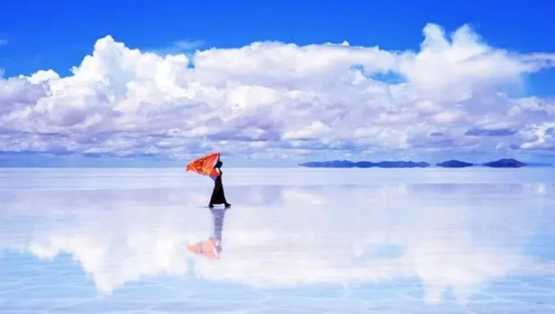 每年的7到11月,湖水便会填满这个占地2万公顷的咸水湖,无风的时候,这里就像时间静止一样,俯瞰,有自己的倒影,还有远处不知是空中还是水中的白云。
