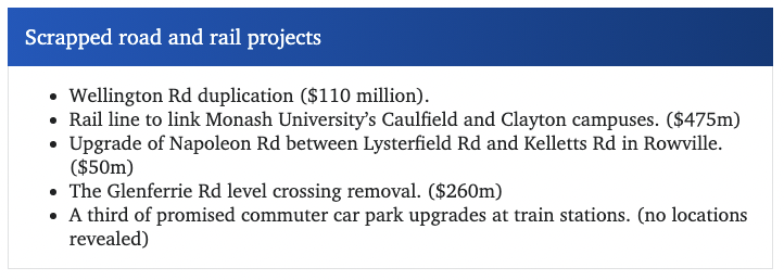 有好消息当然也有坏消息,墨尔本至少有 9 亿刀的基础设施项目被砍掉,包括如下这下:
